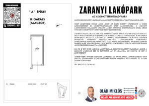 A kínált ingatlan az A épület 8. számú garázsa, amely 24,27 m²-es alapterületű, mely önálló helyrajzi számmal rendelkezik. A garázs tervezésénél a maximális komfortot helyezte előtérbe: a Zaranyi Lakóparkban található lakások rendkívül könnyen megközelíthetőek, legmodernebb szekcionált garázskapuk kerülnek beépítésre, elektromos mozgatással, valamint minden garázs saját villanyórával (1x32 Amper) rendelkezik, ezáltal még elektromos autó töltésére is adott a lehetőség.